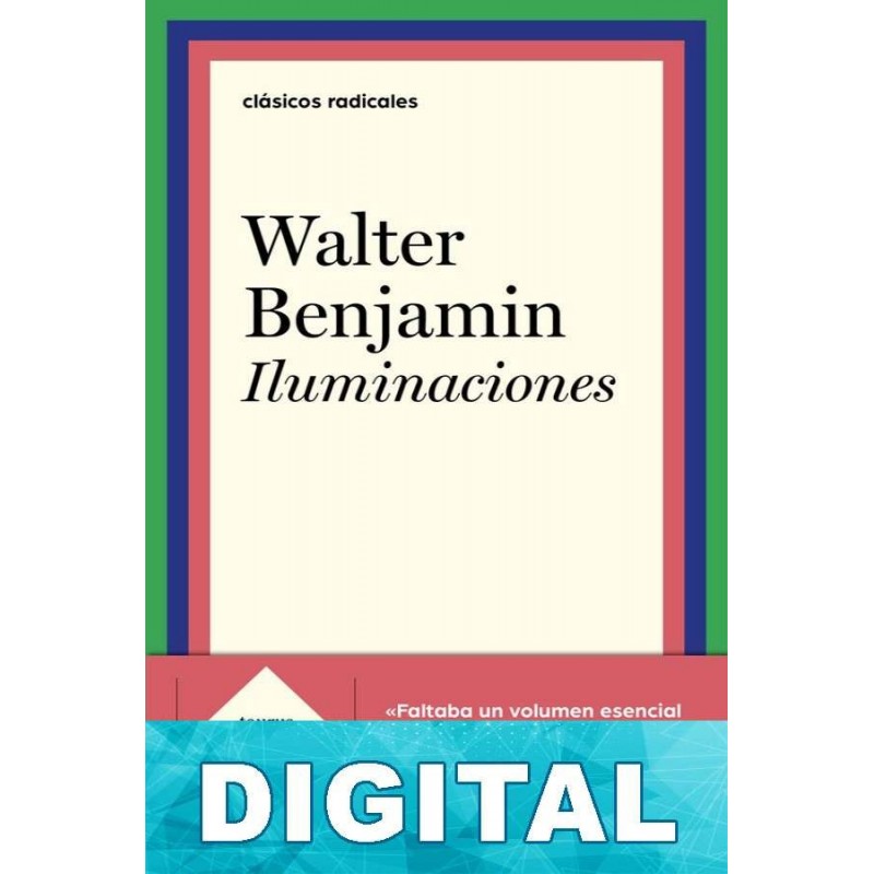 Esta es la primera selección que se publica en España de los textos fundamentales de Walter Benjamin, escogidos cuidadosamente a partir de los cuatro volúmenes deIluminaciones y el de Discursos interrumpidos. Benjamin fue uno de los críticos culturales más originales e indispensables del siglo XX.Este libro incluye, entre otras reflexiones, las que dedica a Kafka, a quien le unía una estrecha afinidad personal, sus estudios sobre Baudelaire, Proust y Brecht, así como su ingenioso (y emblemático) texto «La obra del arte en la era de su reproductibilidad técnica», una discusión esclarecedora de la traducción como modo literario y sus tesis sobre la filosofía de la historia.